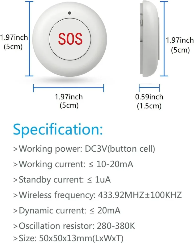 The Wireless SOS Emergency Alarm Button allows users to trigger an immediate alarm by simply pressing the SOS button. Once activated, it sends a wireless signal to a compatible alarm panel, triggering alerts, sirens, or notifications to caregivers or security personnel.